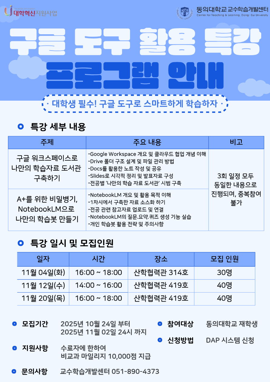 교수학습개발센터에서는 학습과 과제 수행에 실질적으로 도움이 되는 구글 도구 활용 능력을 지원하고자 「구글 도구 활용 특강」을 운영하고자 합니다.