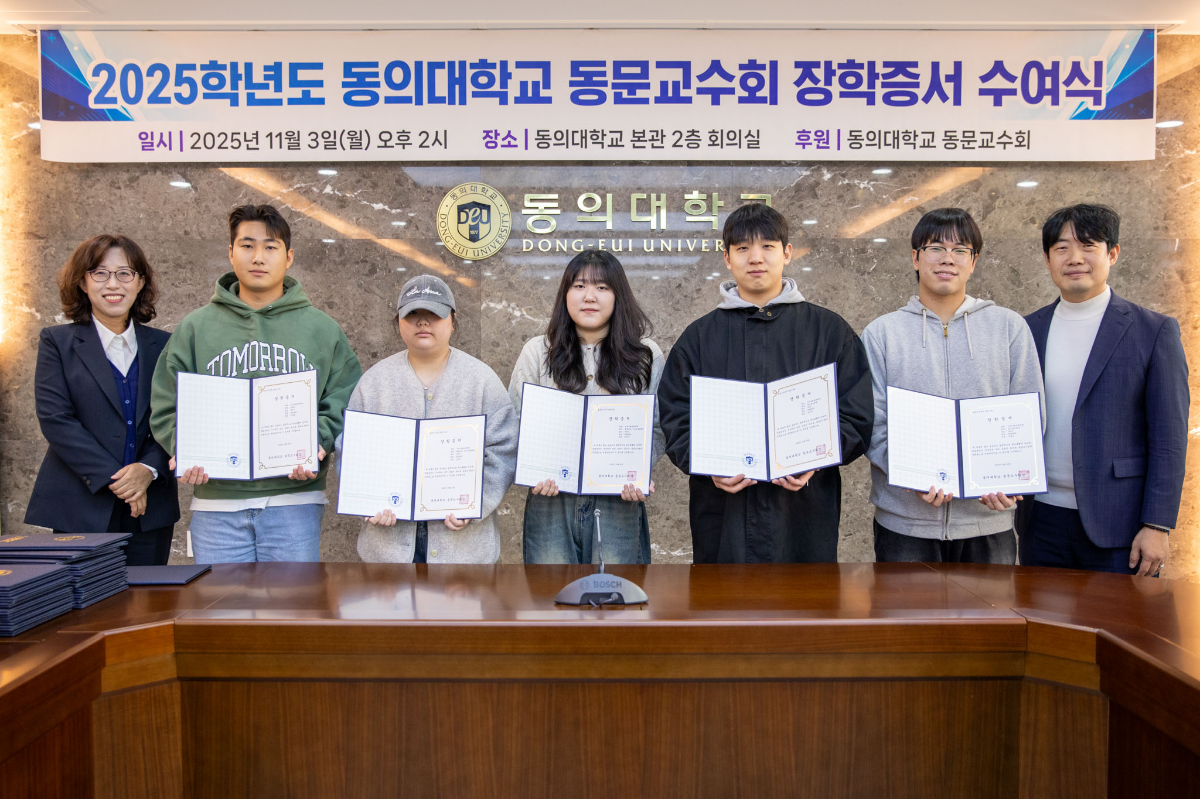 지난 11월 3일 동의대학교 개교 48주년을 맞아 진행된 동문교수회 장학금 전달식에서 우리 학과의 3학년 정은아 학생/1학년 강민서 학생이 장학금을 수여하였습니다.